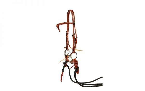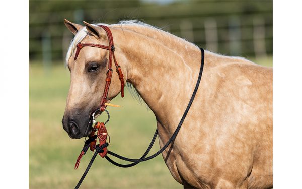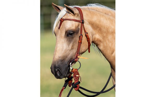 The basket stamp mecate set comes with a basket stamp headstall, a snaffle bit of your choice, a curb strap, your choice of one- or two-piece slobber straps, and a set of durable, 22-foot long rope reins.