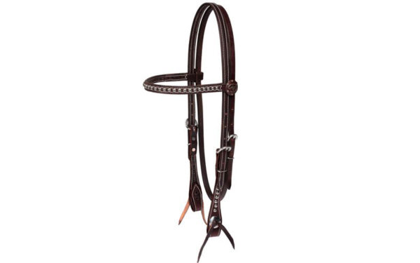This headstall offers a high-end look with a touch of sparkle. Browband and cheekpieces are adorned with etched silver scallops. A roo-logoed concho that is surrounded by silver scallops highlights either side of the browband.