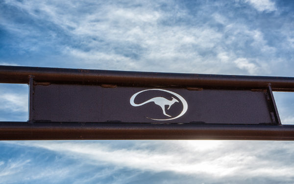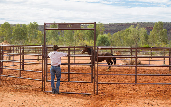 The arch gate features a custom laser cut Clinton Anderson Signature logo with a durable and safe piston latch with a permanently mounted striker plate for easy opening and closing. The gate is also five rails with a 9-foot tall arch and offers 7 feet of clearance.